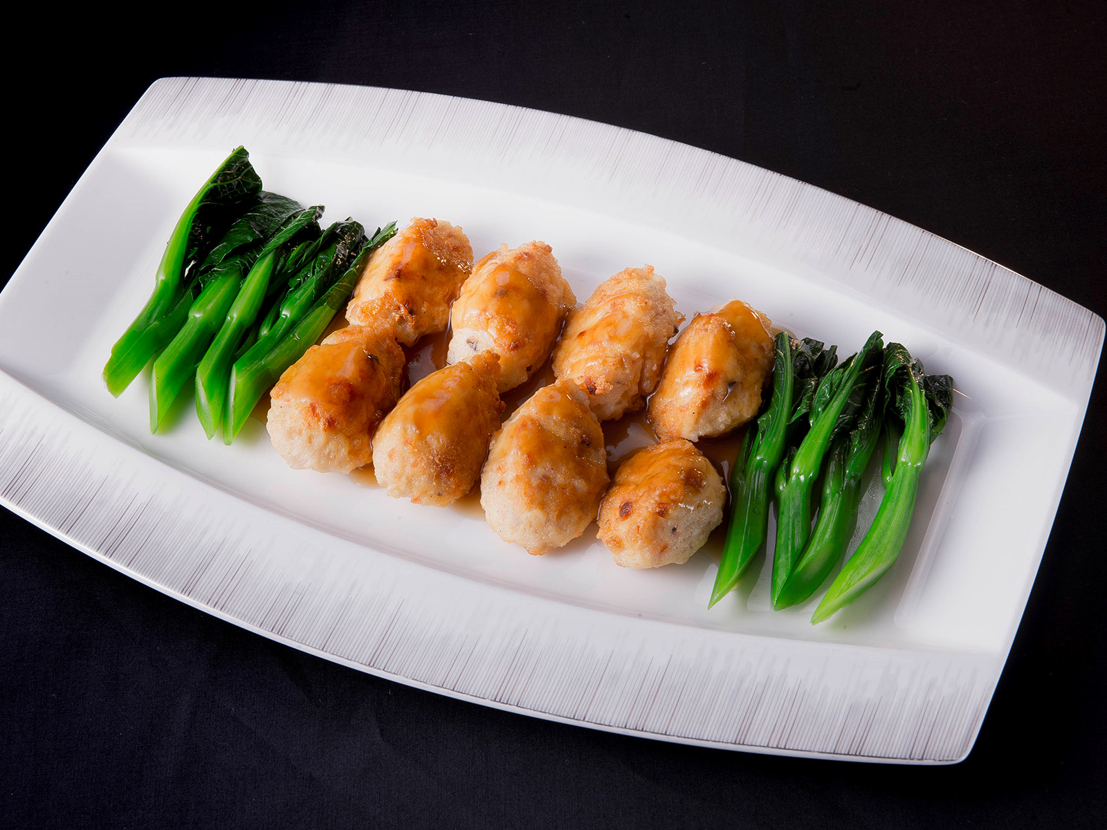 Cook chicken broth with oyster sauce and sugar. Thicken with corn starch then pour over the golden tofu. Garnish with poached vegetables.